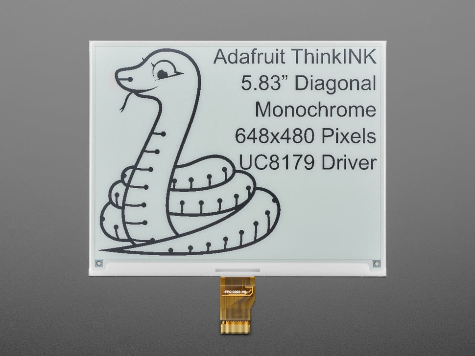 This is a 5.83" Monochrome Black/White Display. It has 648x480 black ink pixels and a white-ish background. It uses the UC8179 chipset, so make sure whatever firmware code you are planning to use has support for it. The Arduino library we wrote does all the work for you; you can just interface with it as if it were an Adafruit_GFX compatible display.