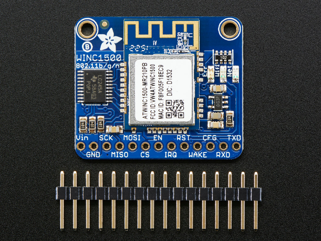 Connect your Arduino to the Internet with this fine new FCC-certified WiFi module from Atmel. This 802.11bgn-capable WiFi module is the best new thing for networking your devices, with SSL support and rock solid performance - running our adafruit.io MQTT demo for a full weekend straight with no hiccups (it would have run longer but we had to go to work, so we unplugged it). We like these so much, they've completely replaced the CC3000 module on all our projects.