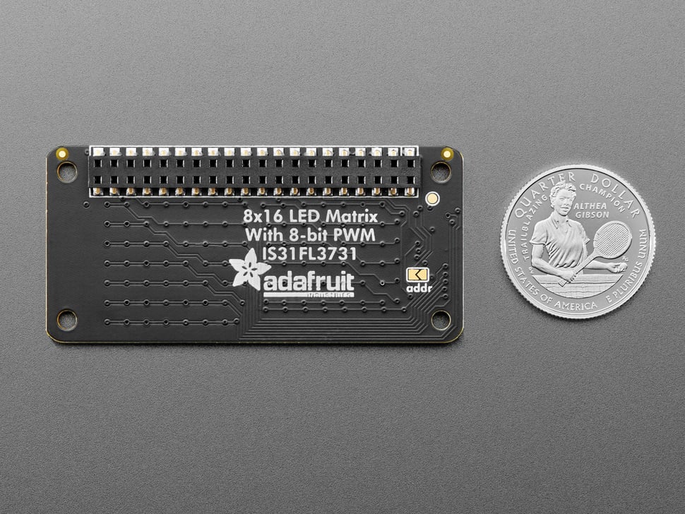 What is particularly nice about this Wing is that the I2C LED driver chip can PWM each individual LED in a 16x8 grid so you can have beautiful LED lighting effects without a lot of pin-twiddling. Simply tell the chip which LED on the grid you want lit and what brightness, and it's all taken care of for you. You get 8-bit (256 level) dimming for each individual LED.