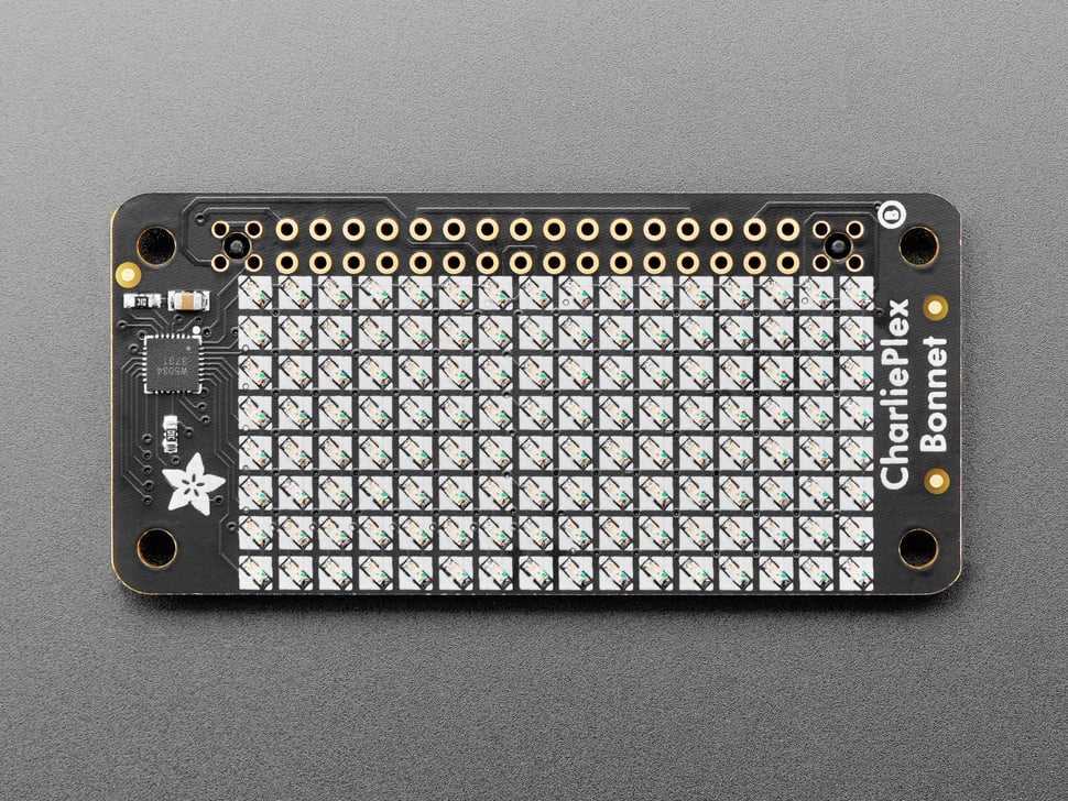 You won't be able to look away from the mesmerizing patterns created by this Adafruit CharliePlex LED Matrix Display Bonnet. This 16x8 LED display can be placed atop any Raspberry Pi computer with a 2x20 connector for a beautiful, bright grid of 128 charlieplexed LEDs. It even comes with a built-in Charlieplex driver that runs over I2C.
