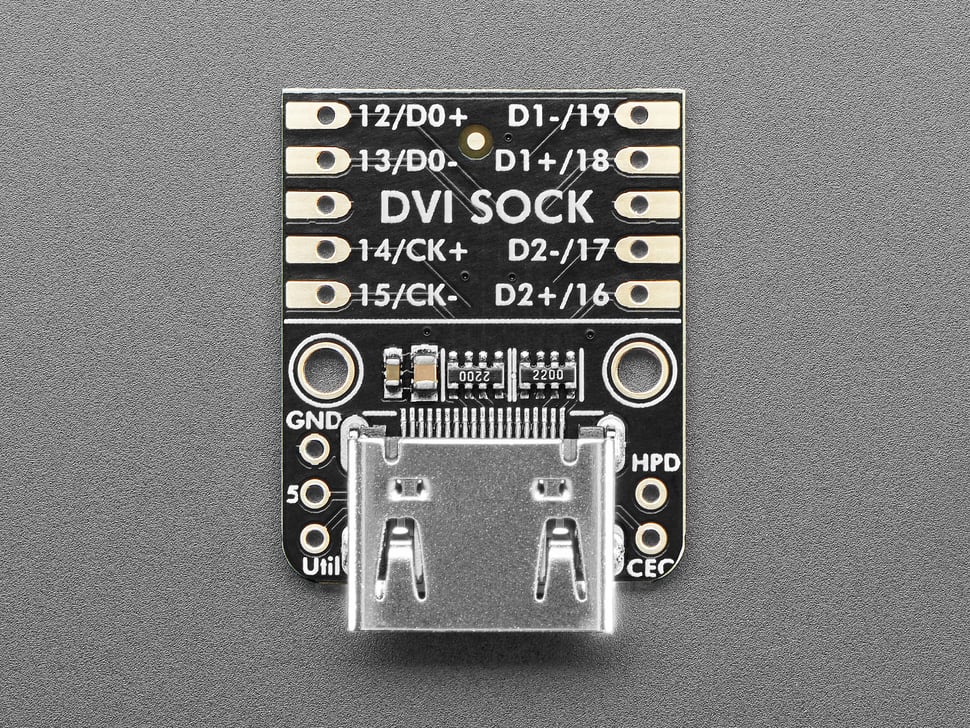 We also breakout the 5V, GND, Hot-Plug Detect, CEC and Util pins, for more advanced hacking. Note that while technically you're supposed to provide 5V to the DVI port, it isnt convenient to do so on the Sock so it's left disconnected. Since the 5V is used for the I2C EDID EEPROM and we don't care about it, the 'Sock will work just fine without.