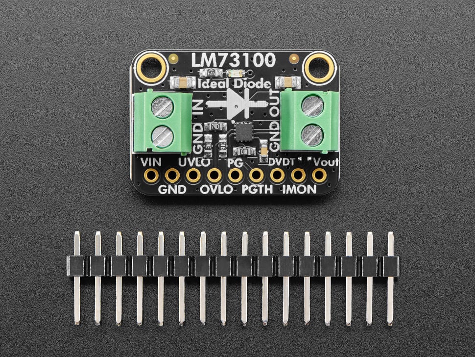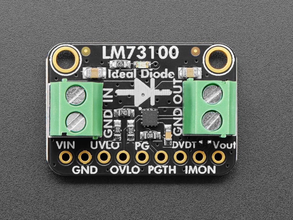 If your project is moving a lot of power around, and efficiency is key, an Adafruit LM73100 Ideal Diode breakout is a great way to keep your power budget tidy! As long as your power supply is 3~23V DC and up to 5A, use this in place of a diode to keep current flowing one direction. However, unlike a diode, you won't suffer a 1V+ forward drop which just gets lost as heat. Instead, the internal chip has two back-to-back FETs, with a typical Rdson of 30 mΩ. That means that even with 5A, you'll lose around 150mV. This makes it perfect for efficiency-sensitive setups like solar panels and LiPoly batteries.