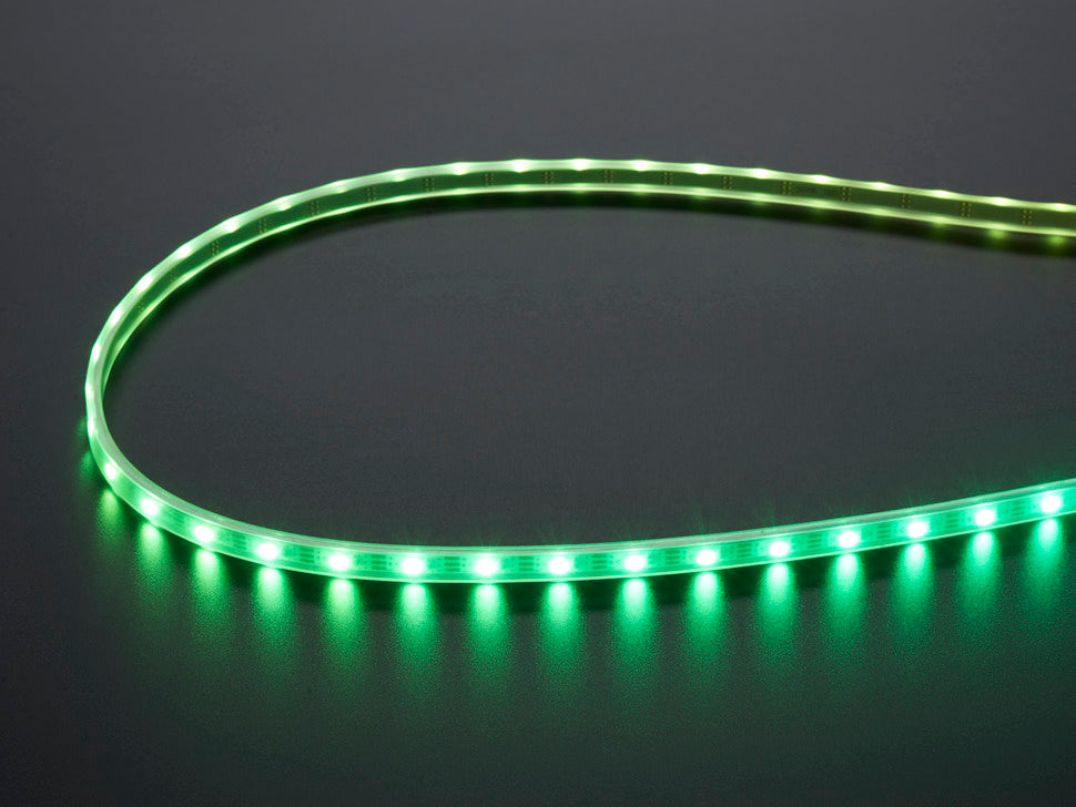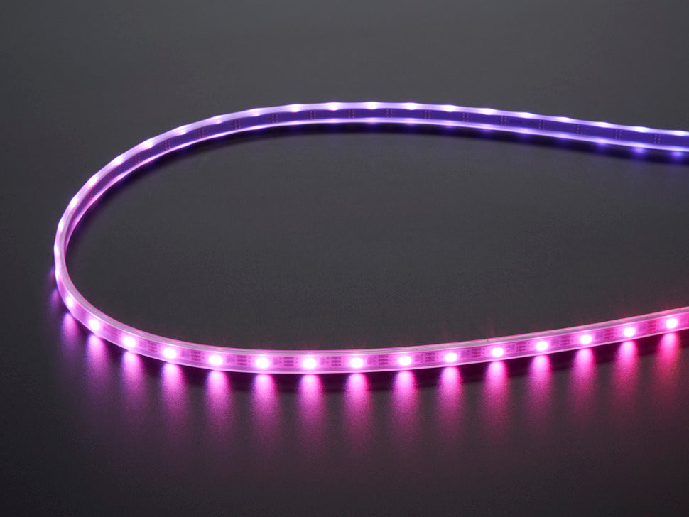 There are 60 RGB LEDs per meter, and you can control each LED individually! Yes, that's right, this is the digitally-addressable type of LED strip. You can set the color of each LED's red, green and blue component with 8-bit PWM precision (so 24-bit color per pixel). The LEDs are controlled by shift-registers that are chained up down the strip so you can shorten or lengthen the strip. Only 1 digital output pin are required to send data down. The PWM is built into each LED-chip so once you set the color you can stop talking to the strip and it will continue to PWM all the LEDs for you