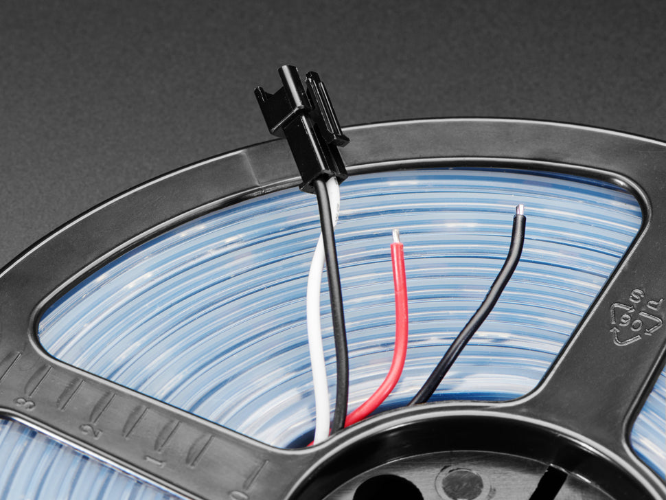 To wire up these strips we suggest picking up a 2.1mm DC jack to wire in so you can connect one of our wall adapters to power it. For the data + ground pins, you can pick up 2-pin JST set to turn it into a quick connection.