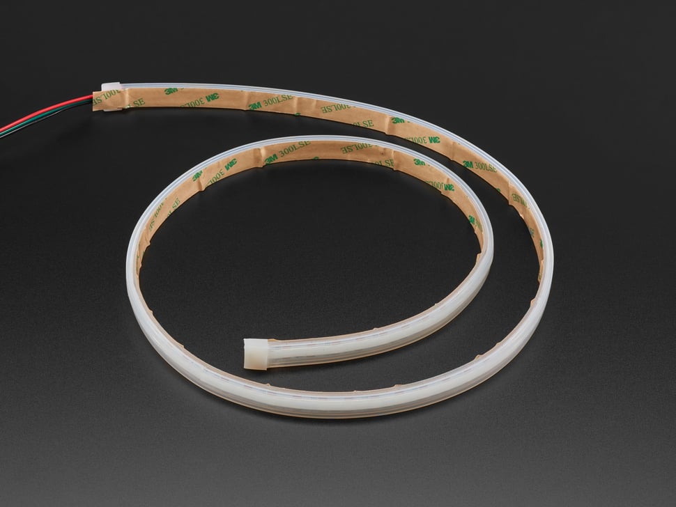 The Adafruit NeoPixel 180 LED-per-Meter Silicone Bead LED Strip is 1 meter long and 10mm wide. The strips come on a reel with three 10cm long wires connected to a JST SM 3-pin plug and a 3-pin socket on the other. The wires are even nicely color-coded: black for ground, green for signal, red for 5V DC power. You'll get SK6812 LEDs on these strips so you don't need an inline resistor and they work down to 3V logic+power (although they work best at 5V for sure).