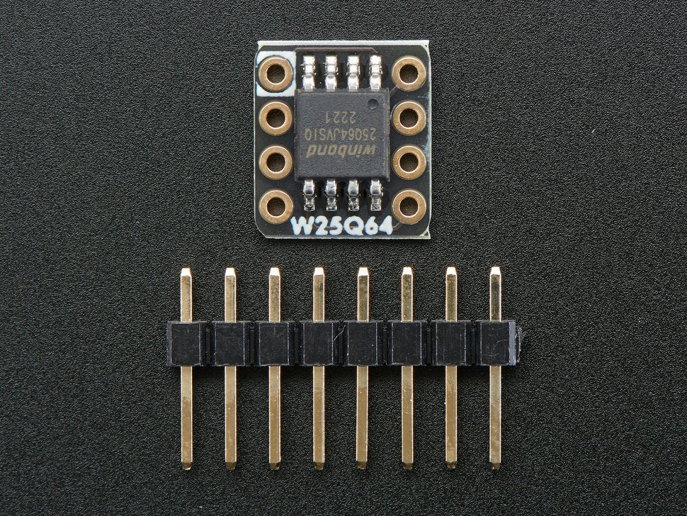 Comes with a bit of header that can be used to solder in and plug into a breadboard or to replace an existing socketed SPI flash DIP chip.