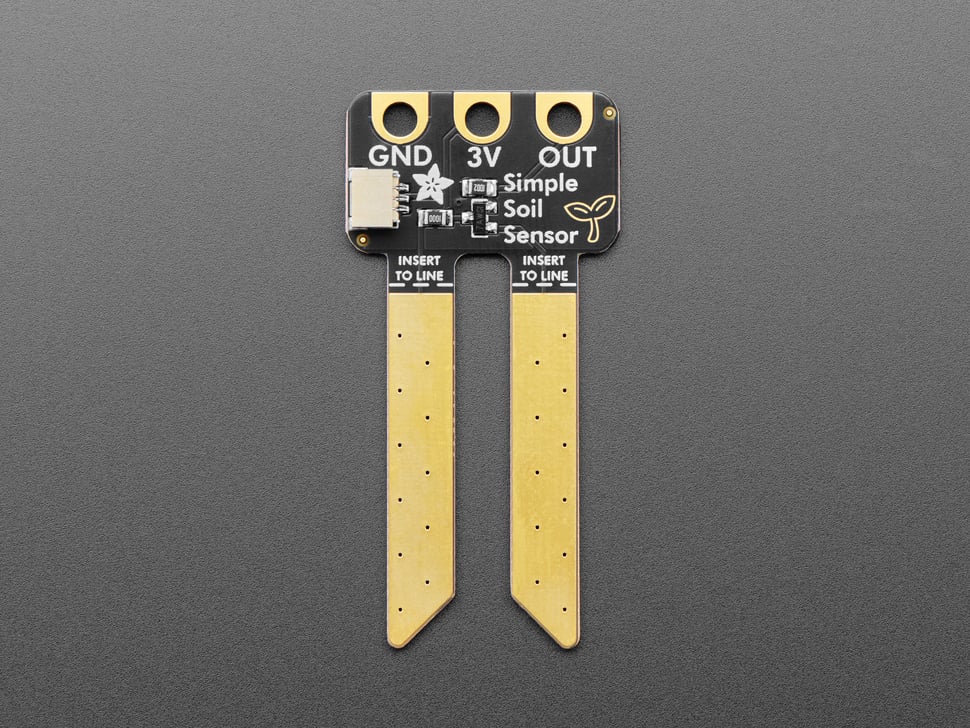 Perfect for educational uses, the Adafruit Simple Soil Moisture Sensor is low cost, and easy to use. This is a simple resistive style moisture sensor, where there's two prongs and the sensor measures the conductivity between the two. We gold-plated the prongs so reduce risk of oxidation - if you see build-up on the prongs, clean them off with a dish-scrubber to keep the sensor going.