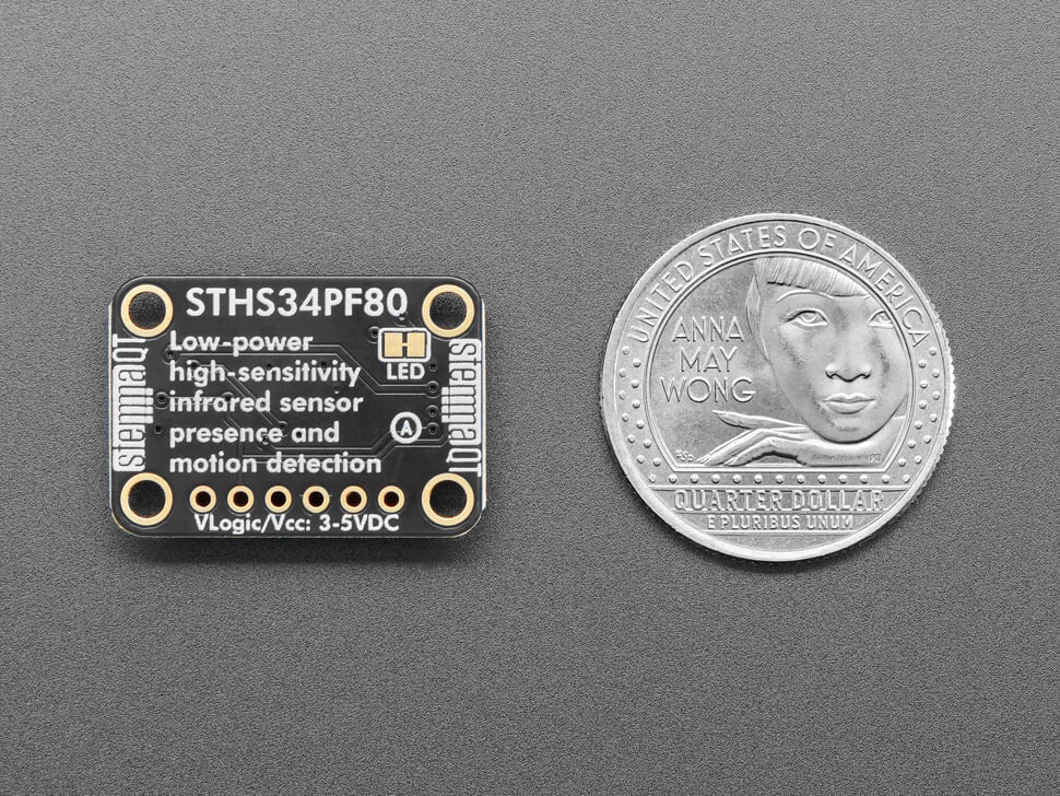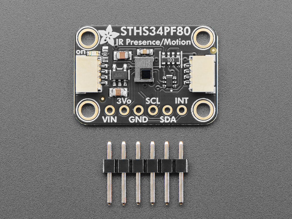 The Adafruit STHS34PF80 IR Presence / Motion Sensor is like a deluxe version of the classic PIR sensor in that it has an IR sensing element that works up to 4 meters away and doesn't require a lens, which makes it easier to integrate into small enclosures. It also comes with a full I2C interface so you can get detailed information about how much IR was detected, and whether there's presence, movement, or temperature changes.