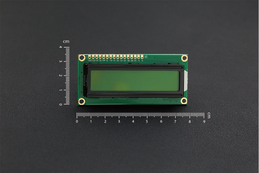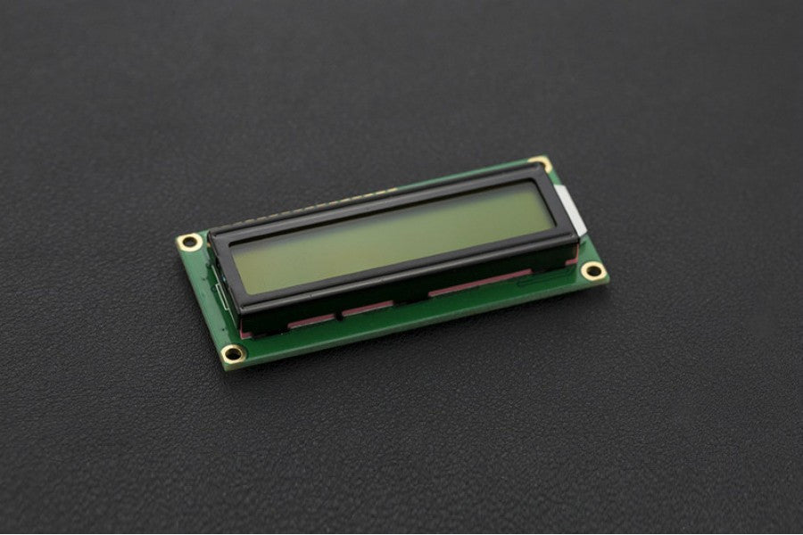 Standard 16x2 character LCD display. It has a basic 16 character by 2 line display with a yellow background with black characters.
