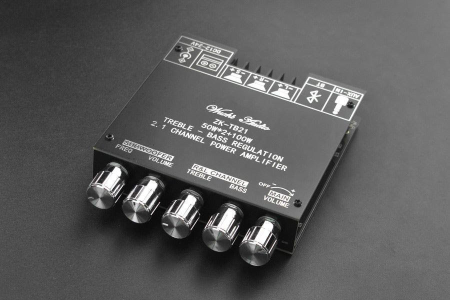 Integrated with 3 output channels, this powerful Bluetooth Amplifier has AM interference and filtering function that makes the board THD as low as 0.1% even when working for a long time at large power output, while bringing you clear and round sound. The board features DC12~24V power supply, AUX+Bluetooth 5.0 audio input, 50W output of left/right channel, and 100W subwoofer output. It has 5 adjustable knobs that are used to power on/off and control main volume, bass and treble of left and right channel, subwoofer frequency, and volume. This product works well with 4-8Ω, 20W-100W passive speakers. You can connect it to Raspberry Pi, mobile phones, and other main-controllers with Bluetooth to DIY your projects.