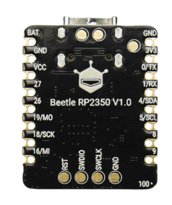 The Beetle RP2350 is powered by the RP2350, a versatile microcontroller developed by Raspberry Pi. It features a unique dual-core and dual-architecture design, offering the flexibility to choose between an Arm Cortex-M33 core or a Hazard3 RISC-V core. Operating at a 150MHz main frequency, with 520KB of RAM and 2MB of Flash, it ensures fast data processing and smooth execution of complex tasks, making it suitable for high-speed computing applications.