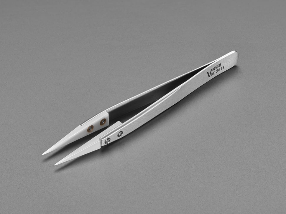You'll need a good pair of tweezers when soldering delicate surface-mount (SMD/SMT) components. These are a great pair of precision, heat-resistant tweezers. They've got a metal body and ceramic inset tips, so they are anti-magnetic and will not bend with use. The tips are fine and pointy to pick up components without risk of scratching, and because they are ceramic, they are also excellent for holding parts during hot air rework or if you're going to get close with your soldering iron.