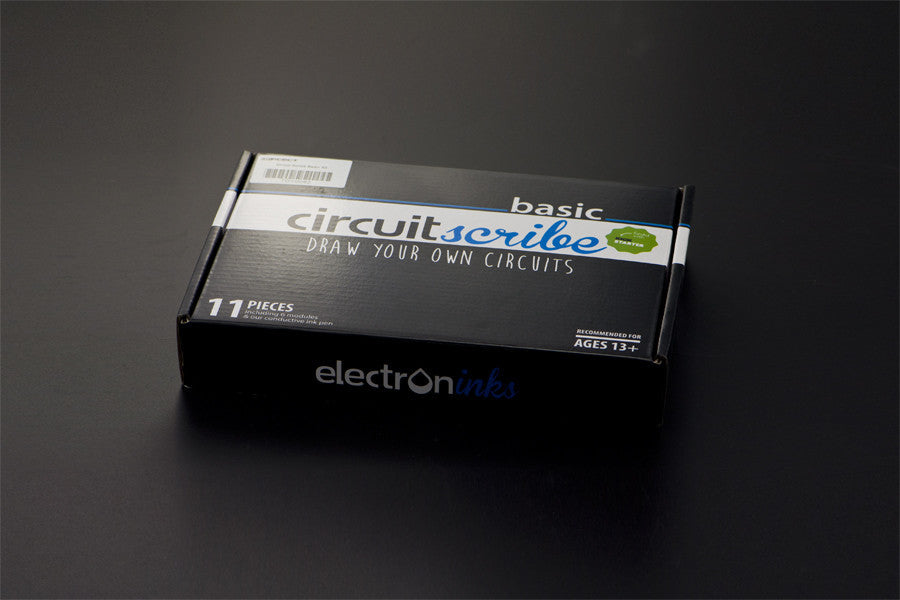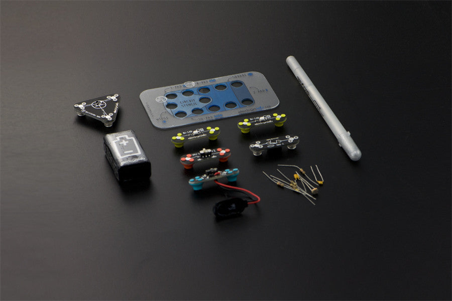 It contains a Circuit Scribe pen, six modules, a 9V Battery and other accessories to improve your circuit drawing experiences (see below for full list). This kit allows you to explore basic electronics concepts, beyond what the Lite Kit offers. The five additional modules allow you to expand your knowledge of transistors, resistance, elements in parallel and series, open and short circuits, and more.