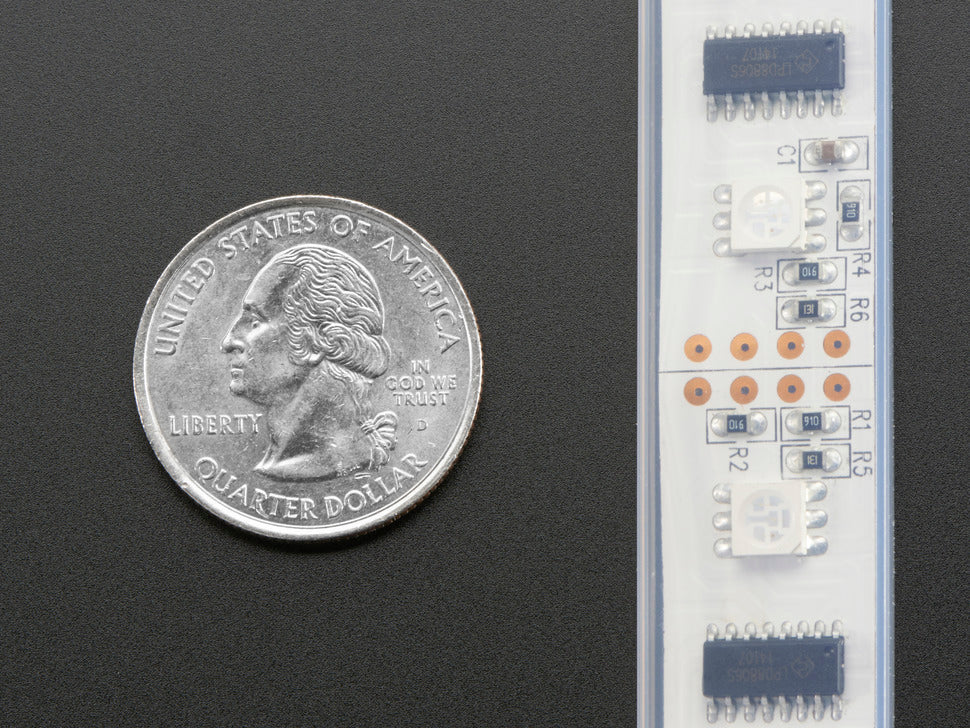 These LED strips are fun and glowy. There are 48 RGB LEDs per meter, and you can control each LED individually! Yes, that's right, this is the digitally-addressable type of LED strip. You can set the color of each LED's red, green and blue component with 7-bit PWM precision (so 21-bit color per pixel). The LEDs are controlled by shift-registers that are chained up down the strip so you can shorten or lengthen the strip. Only 2 digital output pins are required to send data down. The PWM is built into each chip so once you set the color you can stop talking to the strip and it will continue to PWM all the LEDs for you.