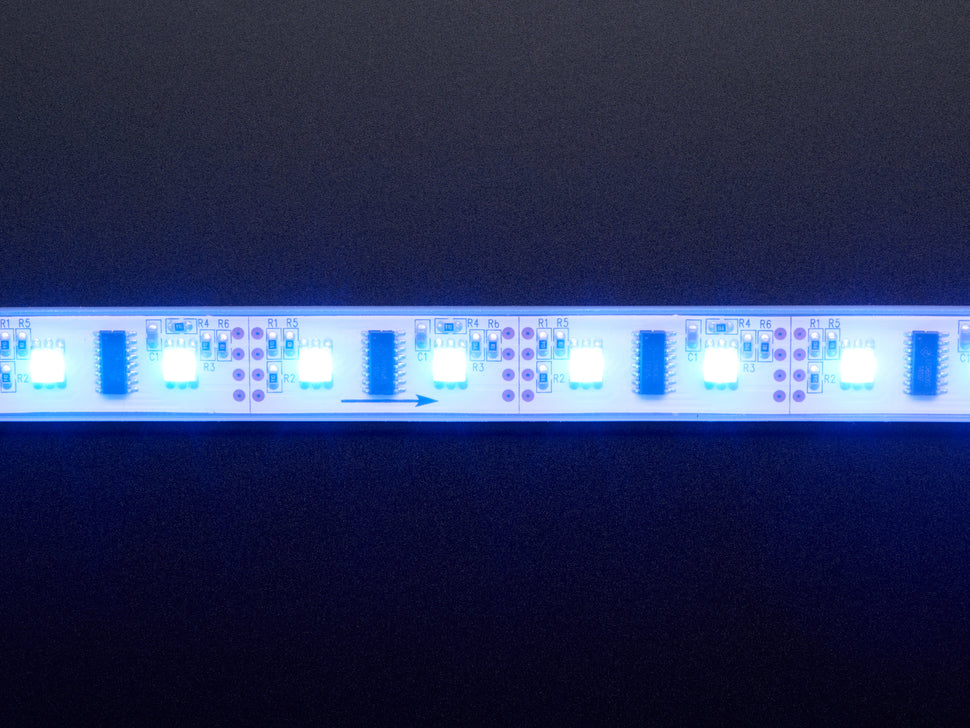 These LED strips are fun and glowy. There are 48 RGB LEDs per meter, and you can control each LED individually! Yes, that's right, this is the digitally-addressable type of LED strip. You can set the color of each LED's red, green and blue component with 7-bit PWM precision (so 21-bit color per pixel). The LEDs are controlled by shift-registers that are chained up down the strip so you can shorten or lengthen the strip. Only 2 digital output pins are required to send data down. The PWM is built into each chip so once you set the color you can stop talking to the strip and it will continue to PWM all the LEDs for you.