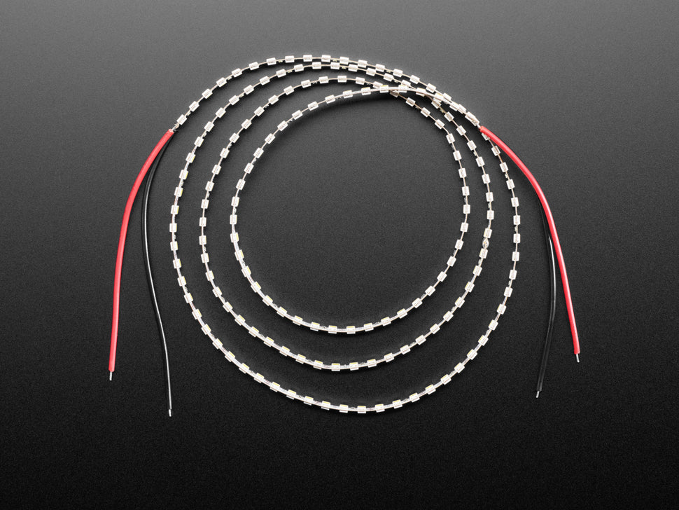 Each order gets a 1-meter-long strip with 2 power wires in red & black. Provide 9V (bright) to 12V (very bright!), and the strip starts to glow. The whole strip draws about 950 milliAmps maximum at 12V, 275mA at 9V. You can cut this strip down if you need to, and even re-solder to it - there are cuttable sections every 17.5mm with solder nubs.