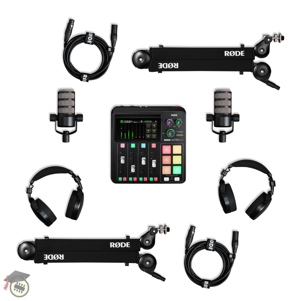 The Duo Podcast Kit offers everything you need to capture incredible audio for your two-person podcast, whether you're experienced and looking to elevate your setup or need a complete solution to start your podcasting journey. It includes a pair of PodMic broadcast-quality dynamic microphones, PSA1+ professional studio arms, NTH-100 professional studio headphones and the RØDECaster Duo – the world’s most powerful all-in-one production solution.