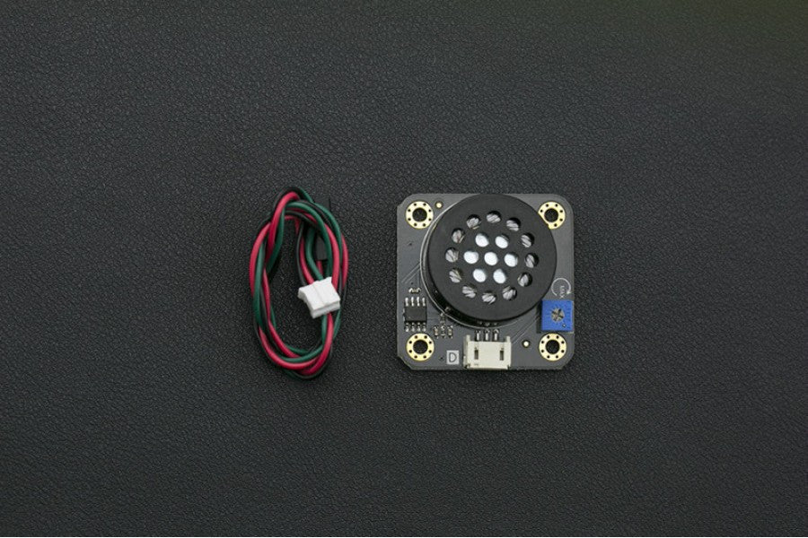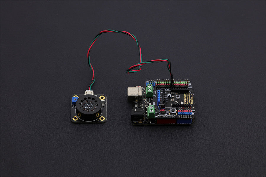 The module has various advantages (e.g. a compact footprint, simple interface, wide voltage input range, long service life). It can be used with an Arduino I/O expansion shield for interactive, sound related creations.
