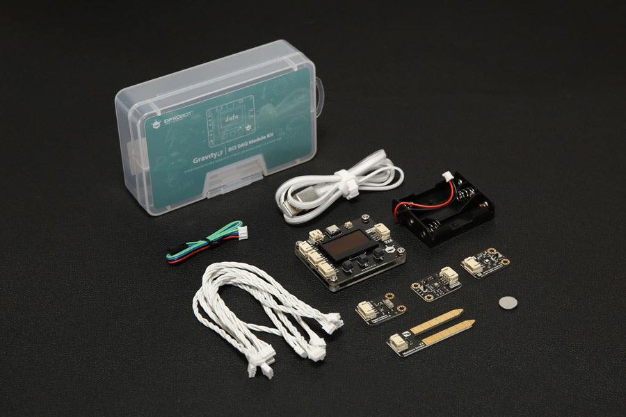 The Gravity: Science Data Acquisition (SCI DAQ) Module is a powerful and highly integrated data acquisition module that incorporates features such as screen display, automatic sensor recognition, sensor calibration, data logging, RTC clock, and data conversion to make data acquisition more convenient and efficient. In addition, the SCI DAQ module has versatile power options and can output physical quantity data collected by sensors through an I2C interface, compatible with micro:bit, Arduino, Raspberry Pi, UNIHIKER, etc.