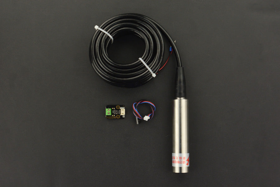We sold this product together with our Gravity: Analog Current to Voltage Converter. The converter can convert current into voltage signal which can be read by your Arduino controllers or other controllers. The throw-in type liquid level transmitter can be used in waterworks, refinery, sewage disposal work, construction, light industry, mechanical and so on.