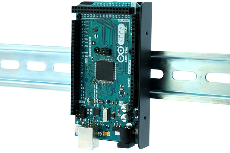 Compatible with a 35mm DIN Rail, this bracket perfectly aligns with the screw patterns and spacing of Arduino UNO R4 WiFi, UNO R3, Arduino Mega, and Arduino Giga WiFi, offering a secure and stable mount.