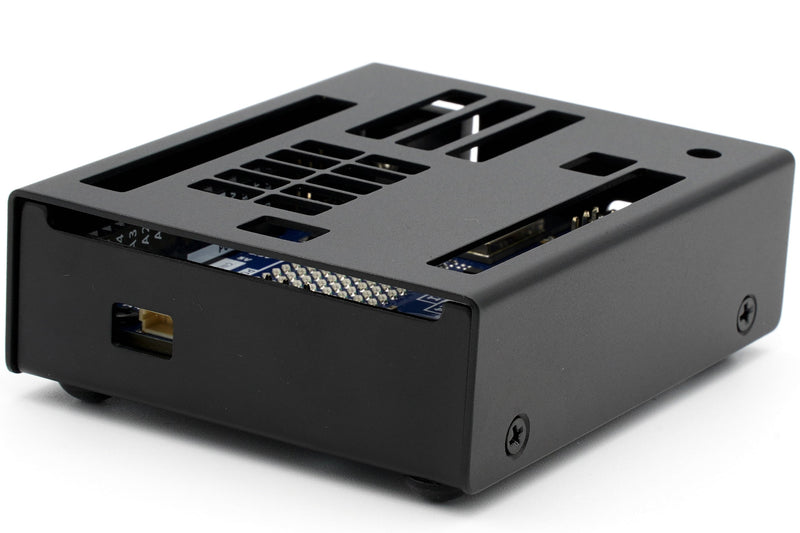 Compact and minimal, this case is suitable for a range of environments. Whether mounted on the DIN Rail, or simply placed on a table or wall, its lightweight yet sturdy construction makes it an attractive addition to any space. Its sleek black anodised coating not only enhances its visual appeal but also ensures durability in diverse conditions.