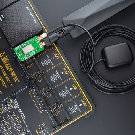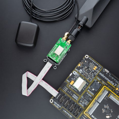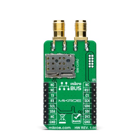 The LTE modem integrates a very flexible transceiver that supports frequency range from 700 to 2200 MHz. Also, it possesses two SMA antenna connectors with an impedance of 50Ω, labeled as GPS and LTE, used for connecting the appropriate antenna that Mikroe has in its offer. Besides those SMA connectors, this Click board™ also has a nano-SIM card slot that provides multiple connections and interface options.