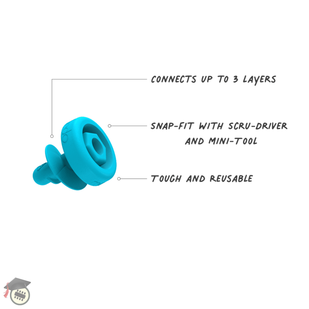 Scru: The heart of the Makedo cardboard construction system. Easily and firmly connect layers of cardboard with the Scru. Completely reusable, just a few quick turns and the Scru is released.