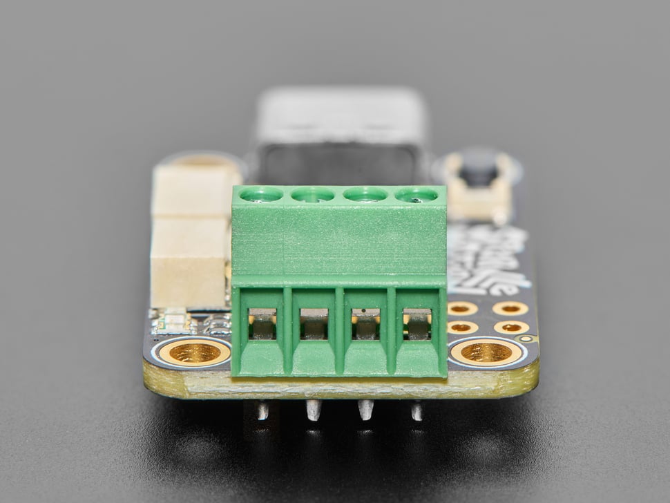 This version includes a pre-soldered terminal block, that means no soldering is required to get started: a small screwdriver will get you going instantly. However, the board is bulkier and the terminal block overlaps half of one of the breakout pads.