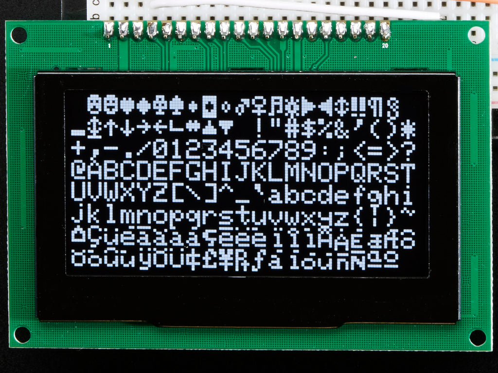 If you've been diggin' our monochome OLEDs but need something bigger, this display will delight you. These displays are 2.7" diagonal, and very readable due to the high contrast of an OLED display. This display is made of 128x64 individual white OLED pixels, each one is turned on or off by the controller chip. Because the display makes its own light, no backlight is required. This reduces the power required to run the OLED and is why the display has such high contrast; we really like this graphic display for its crispness!