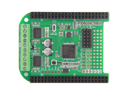 The Motor Bridge Cape features bi-directional motor control using two TB6612FNG integrated dual H-bridge, so it can control two stepper motors or four brushed DC motors with 6~15V DC power and about 1A current draw per motor. The cape provides 5V regulated power to BBG or BBB with a max input voltage of 15V. It also has six servo control interface and six expand IO. All the features are provided by the on board STM32F0 coprocessor. The coprocessor can communicate with BeagleBone by I2C or UART interface.