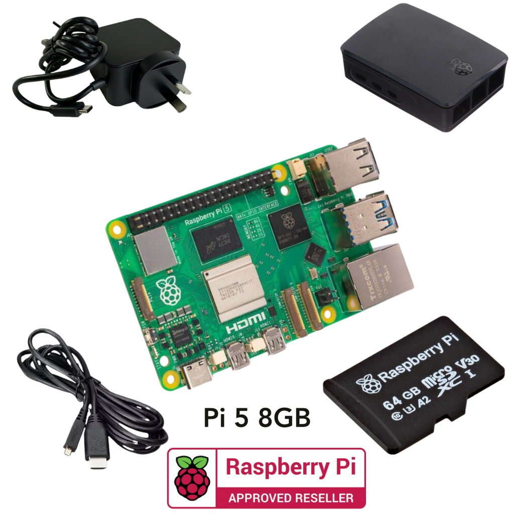Discover the endless possibilities of computing and electronics with the Raspberry Pi 5 Starter Kit 8GB (Black). This all-inclusive package equips you with everything you need to get started: a Raspberry Pi 5 8GB board, an official 1M micro-HDMI to standard HDMI cable, a 64GB official Raspberry Pi card, a white and red official Raspberry Pi case with a fan, and a 27W 5.1V 5A Official black AU plug AC adapter with USB-C connector. Perfect for makers and tech experts looking to expand their knowledge and creativity.
