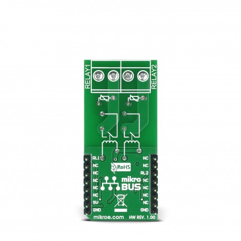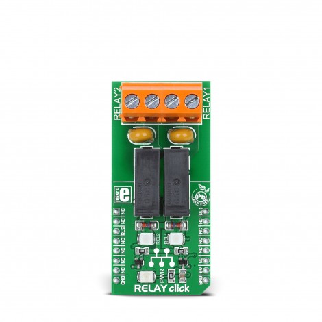 Relay click is a dual relay Click board, which can be operated by the host MCU. This Click board™ offers an elegant and easy solution for controlling a wide range of high power applications. Since it is able to operate on mains voltage level, it can even be used control the power for a number of small home appliances. It can also be used to activate various electromotors, switch on the lights, or power on the entire embedded system.