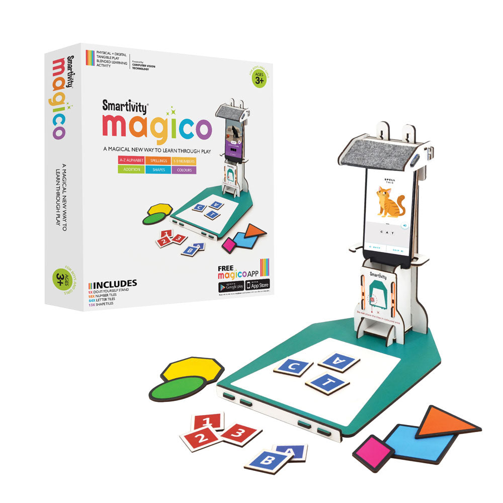 Smartivity Magico - Introducing Magico - Smartivitys latest innovation! Play with Maths, English, Shapes, Colours Empower your child with fundamental concepts in Mathematics, Language (English) and General Awareness through this technology-powered, fun experience called Magico.Physical + Digital Learning Through Play. Magico blends cutting-edge Computer Vision technology with sensory play (Tactile Learning) to deliver a magical, mind-body engagement-focussed experience that the next generation demands and deserves. Transform your smartphone into a powerful educational tool for your child and elevate the passive screen-time to constructive, learning time. Magicos multi-sensory approach encourages your child to explore the worlds of Numbers, Alphabets, Shapes and Colours in a unique, innovative and play-filled environment. (Includes Free App (iOS and Android), Number Tiles, Alphabet Tiles, Shape Tiles and Magico Stand) For Ages: 3 years and older D.I.Y. Time: 10 mins | Play Time: Unlimited - Skills Developed: Visual Thinking, Math and Language, Problem Solving, Creative Ability