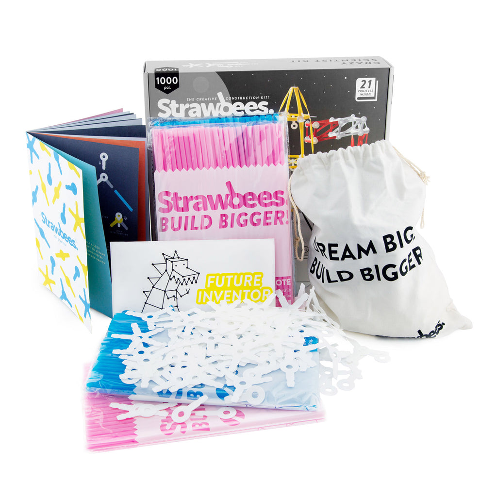 Build big with your friends – The Crazy Scientist kit is massive and enough to build a replica of anything. It features 1000 pcs 21 projects a neat big black collectors bag and an instructions manual. Start creating your own mad scientist lair full of wierd and wobbly inventions or why not try to build one of the seven wonders of the world! The Crazy Scientist kit is also perfect for education. Download the Free Strawbees APP for mor fun challenges.