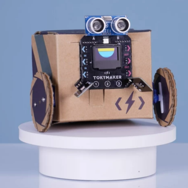 Tokybot is a cardboard made robot powered by TokyMaker.  You will learn how to install light sensors, sonar sensors and servos on the TokyBot, program them to follow the light, or control them with your unique remote controller.The hardware is plug and play, and the programming platform is drag and drop, perfect for all devices and levels!