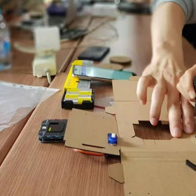 We kept this robot as simple but flexible and functional as possible. That’s why we designed it with structural cardboard. Strong but easy to adapt, remake or fix.