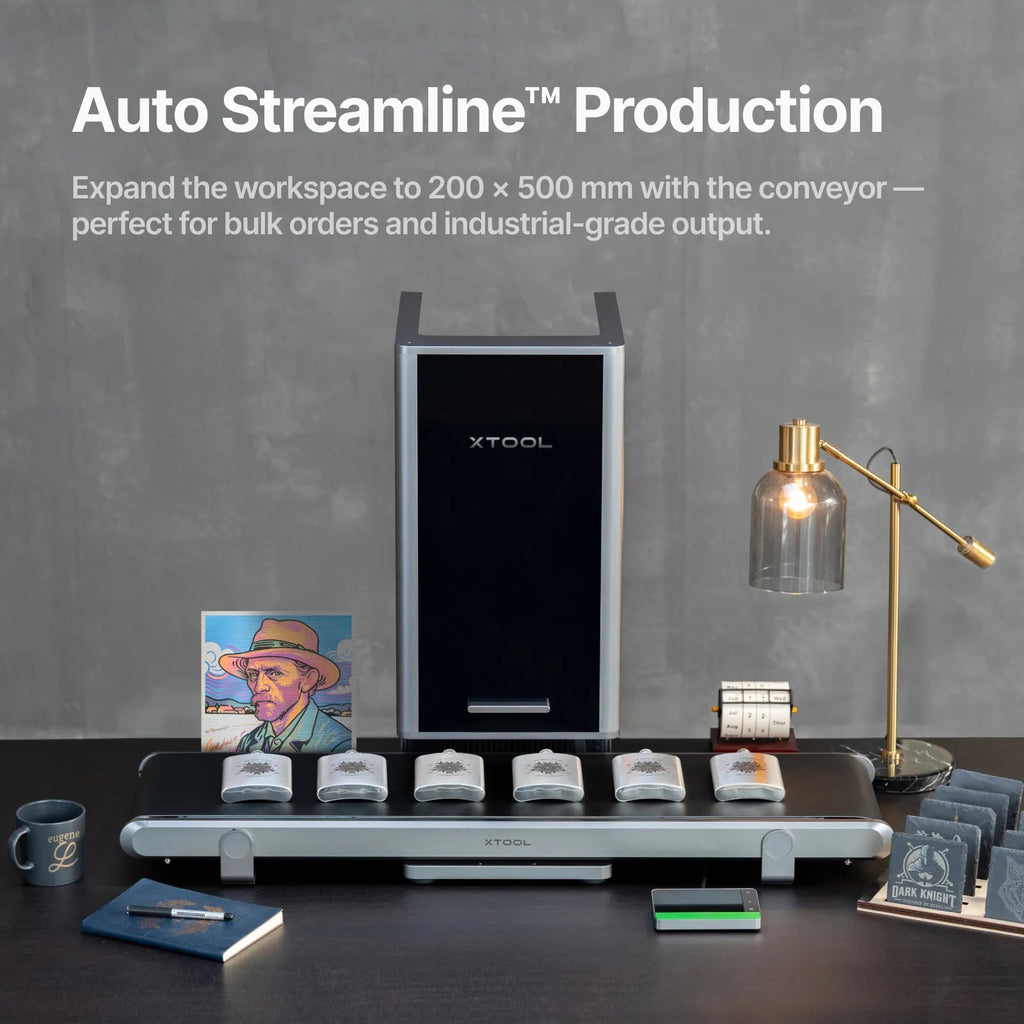 Desktop-level conveyor compatible with F2 Ultra, an automated production solution, designed for small business owners